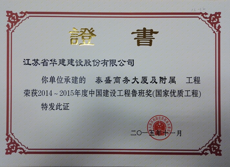 秦皇島泰盛商務大廈 時間:2015-11-23 17540 泰盛商務大廈及附屬工程地處秦皇島市經濟開發區核心位置,集商務辦公、會議中心、一站式服務大廳及報告演藝廳等功能為一體的綜合類商務辦公樓,地下1層,地上23層,裙樓兩層,建筑面積90148㎡,建筑高度97.75米。工程先后榮獲全國建筑業綠色施工示范工程、江蘇省新技術應用示范工程、江蘇省省級工法、河北省結構優質工程獎、河北省建設工程安濟杯獎(省優)、全國優秀項目管理成果獎、全國優秀QC小組成果一等獎。2015年,被中建協評為2014-2015年度中國建設工程魯班獎(國家優質工程)。